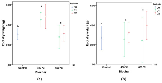 Main value and confidence interval at 95% of root dry weight on the second cycle of a sorghum crop under different application rates of biochar at 400 °C and 600 °C (a) total root dry weight in the growing substrate with the sandy-loam component—S1, (b) total root dry weight in clay-loam—S2. Different letters indicate significant differences (p < 0.05; Tukey’s test).