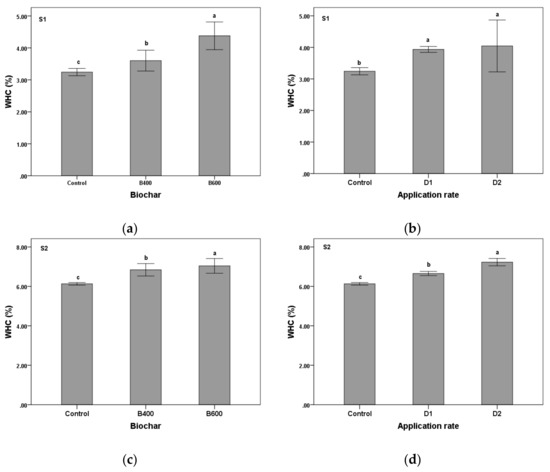 Main value and confidence interval at 95% of substrates water holding capacity (WHC) in two different texture of growing substrates, temperature of biochar applied (400 °C—B400 and 600 °C—B600) and application rate (D1: 1.5 wt. %; D2: 3 wt. %). (a) effect of final pyrolysis temperature of biochar applied on WHC in substrate with sandy-loam component—S1, (b) effect of biochar application rate on WHC in substrate with sandy-loam component—S1, (c) effect of final pyrolysis temperature of biochar applied on WHC in substrate with clay-loam component—S2, (d) effect of biochar application rate on WHC in substrate with clay-loam component—S2. Different letters indicate significant differences (p < 0.05; Tukey’s test).