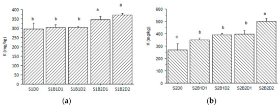 Main value and standard deviation of K concentration in two different growing media with a different application rate of biochar. (a) K concentration in the sandy-loam growing substrate—S1, (b) K concentration in the clay-loam substrate—S2; B1: biochar produced at 400 °C; B2: biochar produced at 600 °C; D1: 1.5 wt. %; D2: 3 wt. %). Different letters indicate significant differences (p < 0.05; Tukey´s test).