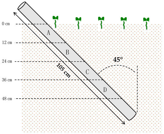Minirhizotron positioning in soil. Transparent tubes (105 cm length, 7 cm diameter) were inserted at 45° angle with a manual auger. Four observation zones were defined: A (0–12 cm), B (12–24 cm), C (24–36 cm) and D (36–48 cm).