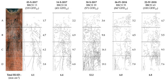 Example of image analysis and quantification of root length surface density. The DK Exception (DKE) cultivar received N+ treatment. Root length surface density (RLSD) values (mm cm−2) are shown in different soil horizons and at different time points of the growing season. The soil horizons are indicated by different letters: A = 0–12 cm; B = 12–24 cm; C = 24–36 cm, and D = 36–48 cm. The BBCH-scale indicates phenological development stages [24,25]. GDD: growing degree days.