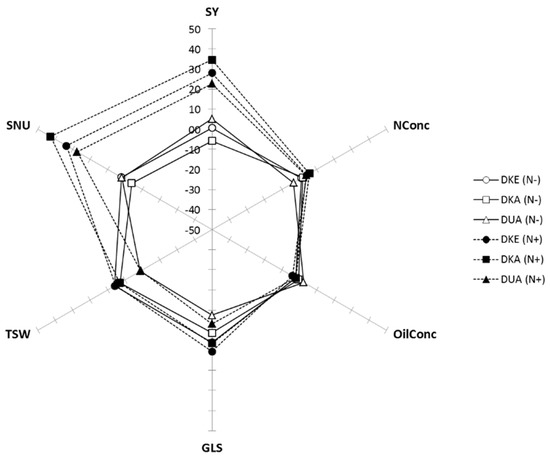 Upon harvest, yield and seed quality traits were measured (Table 1). SY increased by 28.4% in N+ compared to N− plots (4.64 ± 0.39 vs. 3.61 ± 0.51 t ha−1, respectively) and the NConc increased by 4.7% (3.51 ± 0.06 vs. 3.36 ± 0.11 %) (Figure 4, Table 2). NConc and OilConc were negatively correlated, confirming previous findings [43,44]. The GLS and TSW were essentially cultivar dependent.