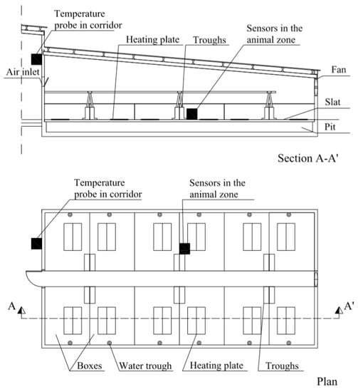 The study was carried out on a conventional intensive pig farm with an authorized farm size of 4895 sows, where piglets were reared to a live weight of 20 kg in 2013. The farm is located in Abegondo, A Coruña, NW Spain (43°10′12″ N, 8°19′30″ W), where temperatures are mild and frost is unusual. In 2013, mean annual temperature was 13.20 °C, mean annual relative humidity was 86.67%, and there were 17 frost days, according to the public network of weather stations, Meteogalicia [53]. The experimental test was conducted in a weaning room, where piglets were reared from 6 to 20 kg live weight. The inside dimensions of the weaning room, with polypropylene slat floors, were 11.82 m in length by 5.86 m in width and 2.50 to 2.25 m in height (Figure 1). The room contained six 2.53 m × 1.97 m pens on each side of a central aisle and housed 50 piglets per pen, up to a maximum of 300 piglets. The manure pit was empty at the beginning of the production cycle and manure was removed at the end of the cycle.