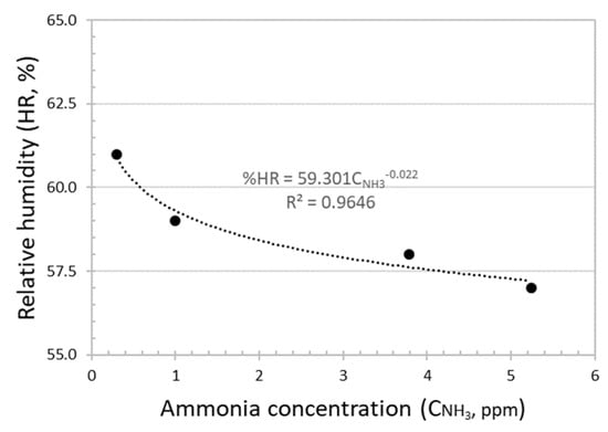 Relative humidity and average NH3 concentration showed an inverse behavior at all setpoint temperatures, which was fitted by the least squares method to a potential function (Figure 2).