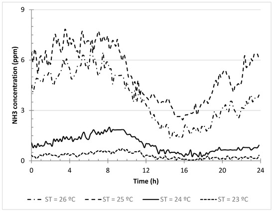 The analyzed days were grouped according to setpoint temperature (Table 2). Overall, average NH3 concentrations decreased with the decrease in setpoint temperature and ranged between 3.79 and 0.30 ppm for 26 and 23 °C, respectively. However, at a setpoint temperature of 25 °C, the average NH3 concentration was 5.24 ppm. A sharp decrease in NH3 concentrations was observed when setpoint temperature decreased from 25 to 24 °C. Such a decrease was caused by a change in setpoint temperature that was related to the increase in the ventilation rate. NH3 concentrations were within the established limits [20,21,22,23].