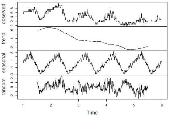 In addition, fast Fourier transform (FFT) was used for harmonic analysis. Before applying the FFT, the additive time series was decomposed into the trend, seasonal, and random components. FFT was applied only to the seasonal component of the series, which provided a good representation of the average of the analyzed days. The trend component was determined by using a moving average and was then subtracted from the series. The seasonal part was computed by averaging for each time of the day over all days. Finally, the random component was the remaining part of the original time series.