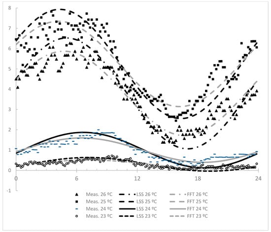 The goodness of fit of the data to a sinusoidal function was characterized by the coefficient of determination, R2, which showed reasonable values, in the range 0.71–0.93 at setpoint temperatures of 23 and 26 °C, respectively. R2 values increased with ST, which suggest a better fit and greater variations for high NH3 concentrations. These findings were supported by other statistics, such as the standard deviation of the error (SDE), which was in the range 0.70–0.09. As SDE and RMSE were identical, mean errors were null. The values of R2 were almost identical in both methods, whereas SDE and RMSE values suggest a better estimation of NH3 evolution by FFT.