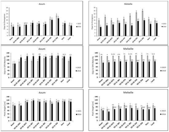 Differences of teff varieties in days to emergence, days to maturity, and plant height in Axum and Mekelle in 2015 and 2016. Means of the teff varieties were compared separately within each location and year considering the main effect of variety. Means with the same letter are not significantly different.