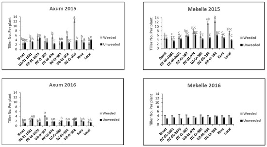 The varieties ‘DZ-Cr-358’ and ‘DZ-01-354’ had the highest number of tillers per plant with average values of 5.82 and 4.48, respectively, but only ‘DZ-Cr-358’ in weeded plots in Axum 2015 had significantly more tillers than all the others. Other than in 2016 in Mekelle, the tillering of the varieties was significantly different in all the locations and seasons (Table 5). The teff varieties ‘DZ-Cr-358’ and ‘DZ-01-354’ had the highest number of tillers per plant in both Axum and Mekelle in 2015 and 2016 on weeded plots (Figure 2). Hand weeding significantly affected the number of tillers per plant (Table 4), and a greater number of total tillers per plant was observed in weeded plots with an average value of 4.53, which was 28.3% higher than in plants from the unweeded plots.