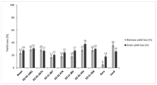 Most of the teff varieties showed wide variation in their biomass and grain yields due to hand weeding (Table 8). The greatest yield losses due to weed competition in unweeded plots was 36% in biomass yield of the local landrace and 38% in grain yield of the variety ‘DZ-01-354’ (Figure 4). The lowest yield losses were recorded from the varieties ‘Kora’ (with a loss of 6% in biomass yield and 18% in grain yield) and ‘DZ-Cr-387’ (with a loss of 17% in biomass yield and 21% in grain yield (Figure 4). On average, the losses in grain yields of the varieties were higher than losses in biomass yields.