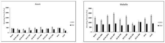 The time taken to weed was longer in Mekelle than in Axum (Figure 5). It was also longer in 2015 than in 2016. The longest time was recorded in Mekelle with an average of 1950 h/ha in 2015, which was lowered to 889 h/ha in 2016, that is, a reduction of 54.4%. In Axum, the longest time for weeding was 574.1 h/ha in 2015, and this was reduced by 39.5% to 347.2 h/ha in 2016. Such a reduction was attributed to the effect of the different teff varieties on weed density, dry weight, and cover. The greatest reduction in weeding time, by 50.6% in Axum and by 54.4% in Mekelle, was observed in plots with the teff variety DZ-Cr-387. The lowest reduction was observed in Mekelle, which was 1.22% in plots with DZ-Cr-358, i.e., the weeding time was almost the same in 2015 and 2016. The average weeding time in plots with DZ-Cr-358 in Mekelle was 1066.7 h/ha in 2015 and 1053.7 h/ha in 2016. There was also a 3.76% increase in weeding time in plots with DZ-01-354 in Axum.