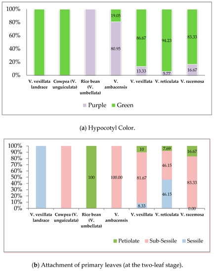 The V. vexillata, V. ambacensis, and V. racemosa accessions showed a resemblance in the primary leaf attachment trait (sub-sessile) to cowpea, presenting a high percentage of accessions for the trait, while the V. reticulata accessions shared the sessile phenotype with the landrace of V. vexillata.
