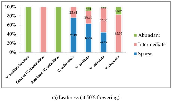 Most V. ambacensis (76%) and V. vexillata (63%) accessions presented a sparse leafy character, which was not the case with any of the checks (Figure 4a). Most V. racemosa and V. reticulata accession shared a common feature of intermediate leafiness with cowpea. Rice bean and the landrace of V. vexillata presented an abundant leafiness, which they had in common with few V. reticulata, V. racemosa, and V. vexillata.