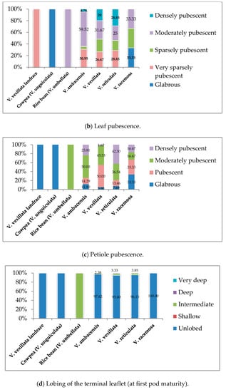 Considerable variations were also observed in the petiole pubescence trait (Figure 4c). Only the V. racemosa accession significantly (33%) shared the common feature of globrous petiole pubescence with cowpea and V. vexillata landrace, and 50% of the V. ambacensis accession showed a moderately pubescent characteristic, which is similar to that found in rice bean. On the other hand, 50% of the V. vexillata accessions were pubescent and did not share the trait intensity with any of the checks. The V. reticulata accessions presented the highest percentage (42%) of the densely pubescent variant within the trait and a considerable percentage (36%) of the moderately pubescent variant.