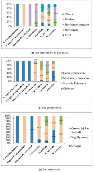 The stem pubescence trait also varied significantly among the wild accessions (Figure 4e). The V. vexillata landrace presented the glabrous variant of the trait, which matched with 15.00%, 17.31%, and 33% of V. vexillata, V. reticulata, and V. racemosa, respectively. The stem of rice bean presented the highly pubescent variant of the stem pubescent trait, as found in 33%, 18%, and 38% of V. ambacensis, V. vexillata, and V. reticulata, respectively. A moderately pubescent variant was found in 31%, 33%, 25%, and 17% of V. ambacensis, V. vexillata, V. reticulata, and V. racemosa, respectively. Finally, 50% of the V. racemosa accessions had the sparsely pubescent variant, while only 36%, 33%, and 19% of V. ambacensis, V. vexillata, and V. reticulata were found to have the same variant.