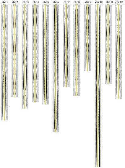 The quality of this genetic map was evaluated by haplotype maps and heat maps, which directly revealed the recombination relationship among SNP markers in the 12 LGs. Haplotype maps were created to reflect the crossover events. The recombination events of the 12 LGs are shown on the haplotype maps (Figure A2). The haplotype maps from 12 LGs showed that all LGs had an extremely low double crossover rate, which indicated the genetic map had a high quality.