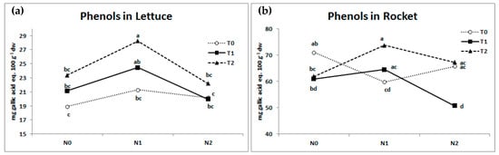 Total phenols content in (a) lettuce and (b) rocket in relation to N fertilization levels (N0 = 0, N1 = 90, and N2 = 180 kg ha−1 for lettuce and N0 = 0, N1 = 60, and N2 = 120 kg ha−1 for rocket) and microbial-based biostimulants (T0 = non-inoculated control, T1 = T. harzianum strain T22, T2 = T. virens strain GV41). Mean values with the same letter were not different according to the LSD test (p < 0.05).