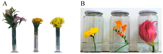 Flowers of oriental lily (Lilium spp. cv. ‘Sweetness’), freesia (Freesia x hybrid cv. ‘Oberon’), and chrysanthemum (Chrysanthemum spp. cv. ‘Marble’) (from left to right) used for the sensorial analysis (A) and GC-MS analysis (B).