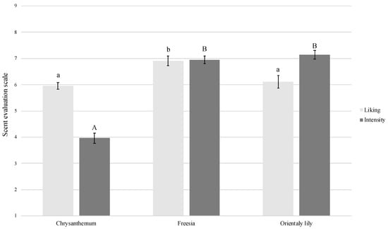 Floral scent liking and intensity of chrysanthemum, freesia, and oriental lily, evaluated through sensorial analysis (±SE, n = 80). The scale ranged from ‘like extremely/extremely high’ (= 9) to ‘dislike extremely/extremely low’ (= 1). Different letters (small = liking, capital = intensity) indicate significant differences in ANOVA followed by a Tukey’s post hoc test (p ≤ 0.05).