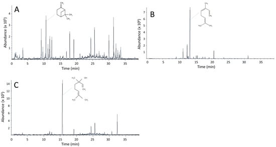 Chromatograms obtained from the analysis through GC-MS to detect the floral scent of (A) chrysanthemum, (B) oriental lily, and (C) freesia, showing the highest peak in each case (β-pinene, β-cis-ocimene, and linalool, respectively).