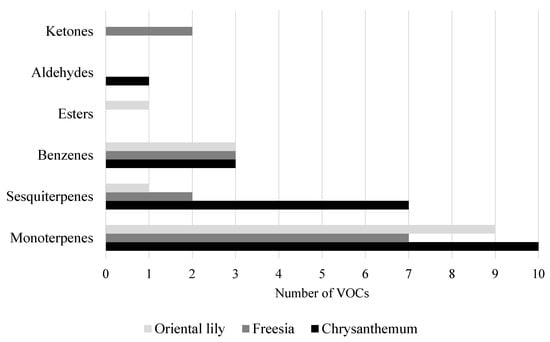 Following terpenes, benzenoid compounds (3) were numerically the next most abundant class of VOCs detected in all three species evaluated while volatile compounds belonging to the groups of ketones (2), aldehydes (1), and esters (1) were exclusively detected in freesia, chrysanthemum, and oriental lily, respectively (Figure 4).
