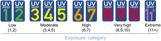 UVI is a non-dimensional index with values from zero upward and indicates the potential damage of UV over humans so that while UVI is higher, higher potential damage and less time to produce it. To a better understanding and public awareness, World Health Organisation et al. [3] recommend using colour codes depending on the exposure category (Figure 1) and establishes a UVI equal to 3 as the threshold from which there exists risk of damage caused by UV radiation and, therefore, sun protection is necessary. Each colour is standardised by the Pantone Matching System (PMS). However, according [5], there is also risk for people with clear skin (skin type I and II, according to Fitzpatrick [6,7] and defined later in Table 1) when they are exposed to a UVI between 2 and 3 during more than 1.5 h.