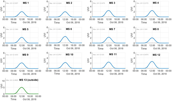 First, the UVI data of a random day for the 13 measurement stations is shown by way of example in Figure 5. In this case, the day shown is a sunny day due to the perfect bell shape of the graphic and it is observed that the risk limit (UVI = 3) is not exceeded at any of the measurement stations inside the greenhouse, although it is exceeded outside.