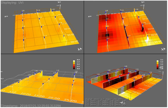 This work also includes a video produced with a 3D representation of the UVI data obtained during the period in which the study has been carried out (See: https://www.youtube.com/watch?v=W6B5GWTYLtA). It shows the variation of UVI for each measurement station at every moment and throughout the year. The four images show different perspectives of the greenhouse and represent the UVI values of the 12 measurement stations inside the greenhouse. For the two images on the left, a fixed UVI colour scale is set (between 0 and 6), while for the two images on the right, the UVI colour scale is variable to show greater sensitivity to changes. A blue marker represents the measure of each station, along with its numerical value at the top. The UVI colour scale is displayed at the bottom of the z-axis, using Markov Random Fields (MRF) to interpolate the rest of the points on the greenhouse colour scale. In the lower right part the date and time represented at each moment are shown. In the lower right part, it can be observed the minimum UVI, the maximum and the maximum difference between the measurement stations. Figure 6 shows an instant capture of this video.