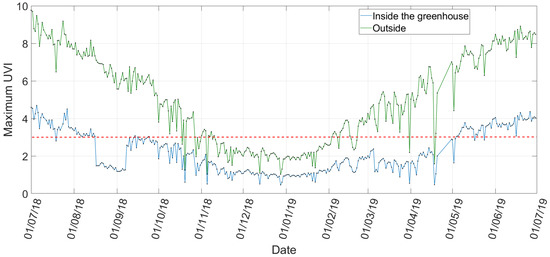In Figure 7 the daily maximum values for UVI both inside and outside the greenhouse during the experimental campaign are gathered. In the case of the interior of the greenhouse, the maximum UVI value shown corresponds to the maximum daily value measured between the 12 measurement stations located inside the greenhouse. The dashed red line represents the limit defined by the World Health Organization from which exists risk of damage to people for UV radiation, as it was explained in Section 1. The maximum UVI value was 4.69 and was measured on 5 July 2019 at 12:44 a.m. by the measurement station 5, while outside the maximum UVI of that same day was 9.48 and was measured at 12:16 a.m.. It can be observed that UVI surpass the risk limit up to in five months: July, August, September, May and June. It has been observed that most of the UVI maximums are recorded by the measure stations 7, 10, 11 and 12, i.e., most of the UVI maximums are recorded in the southwest corner of the greenhouse. It is noticeable a significant drop in UVI between 16 August and 8 September, which results in the risk limit not being exceeded in this period. This is because the plastic cover of the greenhouse was whitewashed on 16 August, which caused part of the UV radiation to be blocked while the effect lasted. This effect usually lasts until the arrival of the first rains.