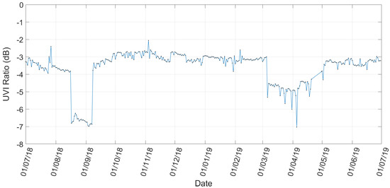 Figure 9 shows the ratio between the maximum UVI value inside the greenhouse () and the maximum UVI outside () in dB, expressed as: