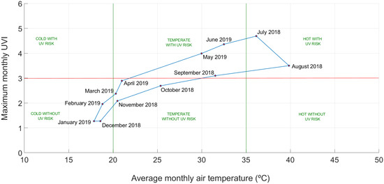 Similarly to the Péguy climogram, we think that it is possible to relate monthly average temperatures and maximum value of the UV index, being able to establish different categories in the Cartesian space that allow to explain the behaviour of the UV radiation and temperature of each month and of the whole year for a determined location. For this, 3 limits have been defined to divide the Cartesian space,: a horizontal line for UVI equal to 3 that defines the risk limit for UV radiation, a vertical line for 20 °C of average temperature that is the limit from cold to temperate and another vertical line for 35 °C of average temperature that is the limit from temperate to hot. The temperature limits has been defined taking into account the climate study carried out by Callejon-Ferre et al. [45]. In this way, 6 categories are established: cold without UV risk, cold with UV risk, temperate without UV risk, temperate with UV risk, hot without UV risk and hot with UV risk, allowing to frame each month in a category and obtaining information of temperature and UV relevant for the interior of a greenhouse, especially useful for the prevention of risks in workers. This has been called “UVIgram” and Figure 12 shows the UVIgram of this study.