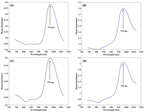 Mean original absorbance spectra for 450 table grapes acquired by (A) the F-750, (B) the SCiO spectrometers; and for 150 peaches acquired by (C) the F-750, and (D) the SCiO spectrometers.