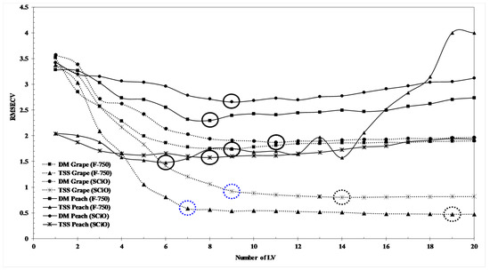 Number of latent variables (LV) versus root-mean square error of cross-validation (RMSECV) values in the partial least-squares regression (PLSR) calibration model to predict dry matter (DM) and total soluble solids (TSS) in table grapes and peach fruits using the F-750 and SCiO spectrometers. Circles indicate optimized number of LV for each model; when two circled points are present in a calibration model, blue dot circle indicates further adjustment to avoid over fitting.