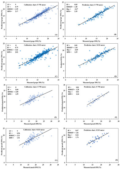 Scatter plot of measured versus predicted dry matter (DM) values of table grapes (A–D) and peach (E–H) calculated using the best PLSR calibration model for the F-750 and SCiO spectrometers. The black line represents the linear correlation between the measured values obtained from the reference quality attribute and their prediction by the model. LV = latent variables, R2 = coefficient of determination, RMSEC = root mean squared error of calibration, RMSEP = root mean squared error of prediction, RPD = performance to deviation ratio.