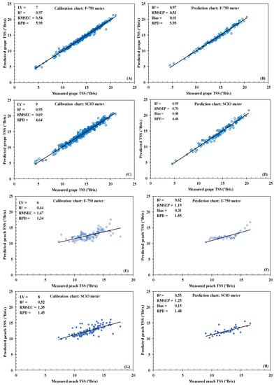 Scatter plot of measured versus predicted total soluble solids (TSS) values of table grapes (A–D) and peach (E–H) calculated using the best PLSR calibration model for the F-750 and SCiO spectrometers. The black line represents the linear correlation between the measured values obtained from the reference quality attribute and their prediction by the model.
