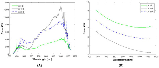Mean signal-to-noise ratio (SNR) of Teflon absorbance spectra measured at different room temperatures with the F-750 meter (A) and with the SCiO meter (B), across their respective full wavelength range.