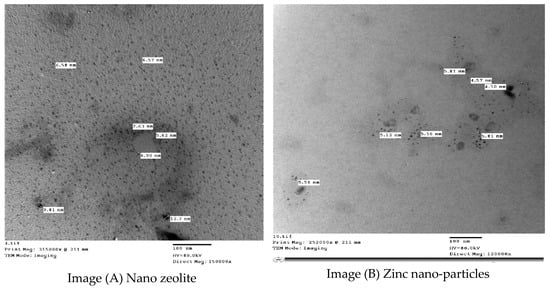 Nano-zeolite was prepared according to [36] then was loaded with nitrogen (Figure 1A) and (Table 3) according to [37]. Transmission electronic microscope examination and imaging (TEM) were done at the Research Park of Faculty of Agriculture, Cairo University (FA-CURP). Nano-zeolite was added at a rate of 1.3 L ha−1 through the irrigation network 15 days before planting and 20, 35, 45, and 70 days after planting.