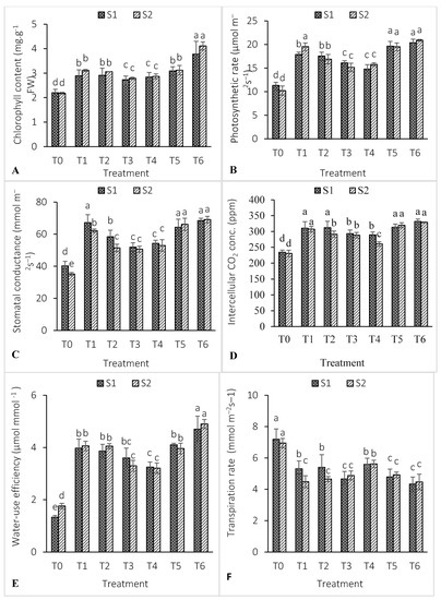 Change in (A) leaf chlorophyll content, (B) photosynthesis rate, (C) stomatal conductance, (D) intercellular CO2 conc., (E) water use efficiency, and (F) transpiration rate in saline soil due to nanoparticles application. Columns with similar letters show no significant differences at p ≤ 0.05 (LSD). Bar indicates standard deviation (SD). Treatments were organized as follow: (±SD). (T0) = control, (T1) = n-Zeolite, (T2) = n-Zn, (T3) = n-B, (T4) = n-Si, (T5) = n-Zn + Si +B, (T6) = n-zeolite + Zn + Si + B, (S) = seasons ‘1 and 2′.