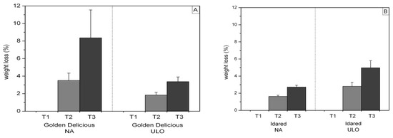 Impact of storage type on weight loss (%) in (A) ‘Golden Delicious’ and (B) ‘Idared’ apples after 10 (T2) and 20 days (T3) of shelf life at 20 °C. Values represent mean ± standard deviation (S.D.) of measurements made on 20 fruit per storage type and shelf life period.