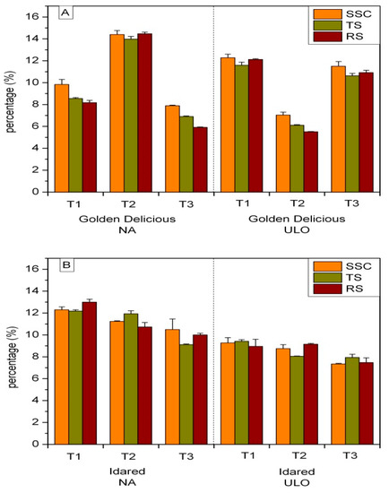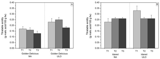 As for titratable acidity, ‘Golden Delicious’ apples from ULO chambers had a higher total acids content compared to the fruit of the same cultivar stored under NA conditions. In ‘Golden Delicious’ apples from the ULO chamber and ‘Idared’ apples from the NA chamber, a slight increase in TA was noticed (Figure 3).
