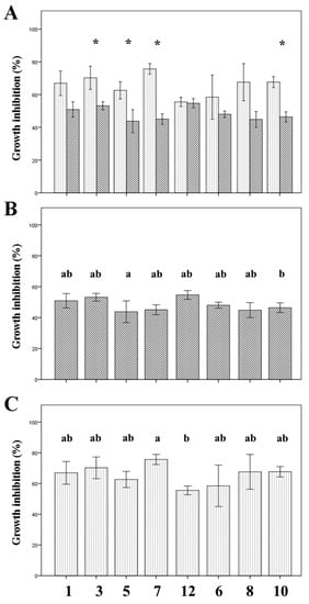 F. oxysporum growth inhibition by wine lactic acid bacteria (LAB). (A): Comparison in the efficacy of the inhibition by the LAB strains when bacteria and fungus were inoculated simultaneously (dark bars) or when bacteria were allowed to grow for 48 h before inoculating the fungus (white bars). Values are mean ± SD. (*): Significant differences (p ≤ 0.05). (B): Comparison of the antifungal effect of the different LAB strains when bacteria and fungus were inoculated simultaneously. (C): Comparison of the antifungal effect of the different LAB strains when bacteria were cultured for 48 h before fungus inoculation. Values are mean ± SD. Different letters indicate significant differences (p ≤ 0.05). 1: LPAUV1, 3: LPAUV3, 5: LPAUV5, 7: LPAUV7, 12: LPAUV12, 6: LPLUV6, 8: LPLUV8, 10: LPLUV10.
