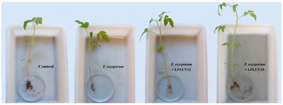 Due to the important economic repercussions that F. oxysporum causes in the agri-food industry, since the year 2000 there is a growing interest in the biological control of this fungus []. In most of the studies, there are genera or bacterial and/or fungal species associated with the roots that have shown a remarkable inhibitory effect on the development of the fungus after its application in tomato plants [,,]. However, as far as we know, only Hamed et al. [], had demonstrated the capacity of lactic acid bacteria (isolated from dairy products) for the bio protection of plants against F. oxysporum, in an experiment that requires the previous protection of the seed with the bacteria. In the present work, the capacity of the strain L. plantarum LPLUV10 of wine origin for the biocontrol of F. oxysporum has been demonstrated by adding it to the irrigation water. On the other hand, previous studies have shown that, in the case of some bacteria of the rhizosphere, their effectiveness as biocontrol agents depends on whether they are used to protect the crop from which they were isolated, showing little or no efficacy in the protection of other cultivations [], which would imply the need to obtain specific biocontrol agents. In the present study it is shown that the malolactic strain LPLUV10 is capable of reducing the pernicious effect of F. oxysporum on tomato plants coming from a different habitat, thus demonstrating potentially, a more broad-spectrum efficacy.
