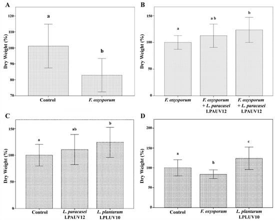 Quantitatively, in the first place, the effect of the fungus on the plant was observed, showing a significant reduction (ca. 20%) of its dry weight after 30 days of culture (Figure 3A). Secondly, the protective effect of the lactic bacteria analyzed on the harmful effect induced in the plant by F. oxysporum was demonstrated. Figure 3B shows a significant reduction in the damaging effect of the fungus, used as a control, in plants treated with wine malolactic bacteria, specifically with the L. plantarum strain LPLUV10 (ca. 24%).