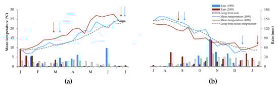 Rainfall (bars) and average temperature (lines) at 10-day interval for Experiment 1 (1999), Experiment 2 (2000) and long-term series (30-year period). Panel (a) refers to the period when seed-tuber mother plants were grown and harvest, panel (b) refers to the period when the same seed-tubers were tested (Experiment 1, and Experiment 2) at open-field level (from the end of August onwards). Arrows represent approximate planting and harvesting dates of seed-tuber mother plants (a) and of experiments at open field level (b) for 1999 (light blue) and 2000 (dark red), respectively.