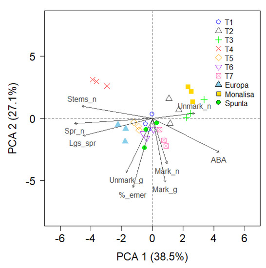 Principal component analysis (PCA) biplot showing patterns and interaction between variables and treatments for Experiment 1. ABA, abscid acid content; Sprout_n, number of sprouts per tuber; Lgst_sprout, the longest sprout; %_emer, percentage of plant emergence; Mark_g, grams of tuber per plant; Mark_n, number of tuber per plant; Unmark_g and Unmark_n, grams and number of unmarketable tuber per plant, respectively. T1: 20 °C; T2: 10/20 °C; T3: 2/20 °C; T4: 38/20 °C; T5: 20 °C + GA3; T6: 10/20 °C + GA3; T7: 2/20 °C + GA3.