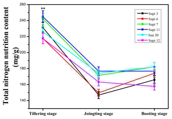 Changes of total nitrogen nutrition (TNN) content in the six barley cultivars at different developmental stages. Data represent mean values standard deviation (SD) from three independent experiments. Bars show standard deviations of the mean. Asterisks on top of the bars indicate statistically significant differences (** p < 0.01, Student’s t-test).