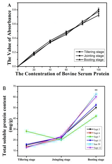 A good linear relationship was observed in a standard curve of soluble protein of bovine serum, with correlation coefficients of 0.9921, 0.9971, and 0.9940, in the tillering, jointing, and booting stages, respectively (Figure 2A). The TSP content was increased with growth (Figure 2B). The mean TSP content increased marginally and ranged from 16.45 (jointing stage) to 21.74 (tillering stage) mg/g FW (p > 0.05); The TSP content reached the peak in the booting stage, and the mean TSP content was 55.10 mg/g FW. The TSP content in the booting stage was significantly higher in the booting than in either tillering or jointing (p < 0.01). The TNN and TSP content showed opposite patterns at different developmental stages.