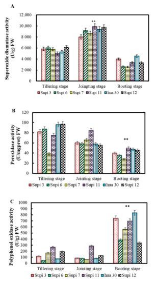 Changes of the superoxide dismutase (SOD) activity (A), peroxidase (POD) activity (B), and polyphenol oxidase (PPO) activity (C) in the six barley cultivars at different developmental stages. Data represent mean values standard deviation (SD) from three independent experiments. Bars show standard deviations of the mean. Asterisks on top of the bars indicate statistically significant differences (** p < 0.01).