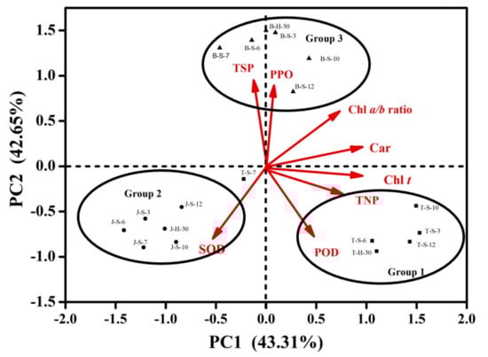 PCA was conducted to elucidate on quality parameters of six barley cultivars at three developmental stages (tillering, jointing, and booting) (Figure 4). The first PCA axis accounted for 43.31% of the overall variance and correlated with the phytochemical constituents. The second axis (42.65% of the variance) was associated with antioxidant potential. The Chl t and Car content, Chl a/b ratio, TNN content, and POD and PPO activities were positively associated with the first PCA axis, whereas SOD activity and TSP content were negatively associated with the first PCA axis. As observed in Figure 4, the three groups were clearly separated at different developmental stages. This further points to the trend that, compared with that in the jointing stage, the Chl t and Car content, Chl a/b ratio, TSP and TNN content, and POD, and PPO activities increased in the booting and tillering stages, whereas the SOD activity decreased. This indicates that developmental stage was the main factor affecting the quality of phytochemical constituents and antioxidant potential of barley grass.