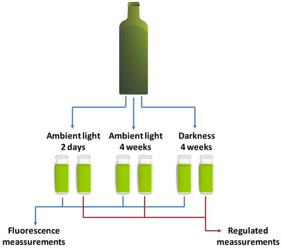 Two out of six aliquots from each initial sample were exposed to natural illumination for two days, two were exposed for four weeks, and two aliquots were maintained under darkness conditions. One bottle of each pair was used for fluorescence measurements. The other bottle was sent to an officially accredited laboratory to obtain physico-chemical characteristics included in Regulation (EEC) No 2568/9 and content of antioxidant compounds (Figure 1). The experimental design provided a total of 24 paired final samples (8 initial samples × 3 illumination treatments = 24 samples) characterized by fluorescence spectroscopic data and analytical data.